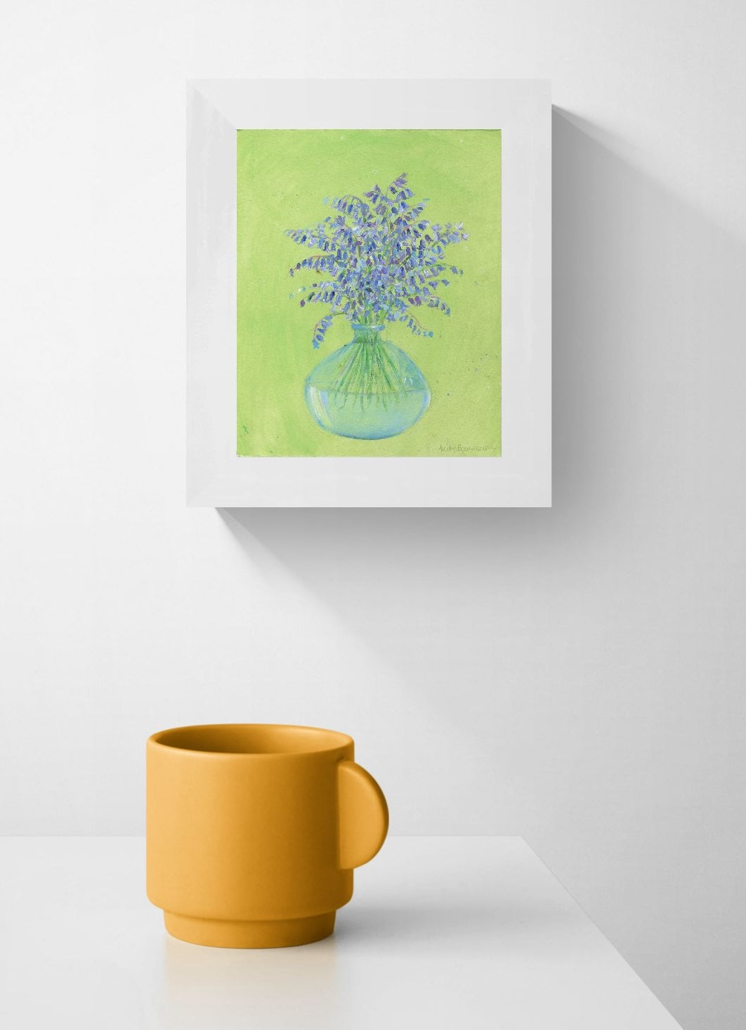 Bring a touch of spring into your home wit this expressive painting of bluebells in a turquoise jar, created using a truly unique method – painted with a twig dipped into acrylic paint. The natural, unrefined strokes give this artwork a raw,...