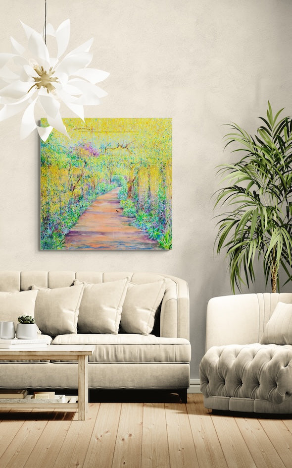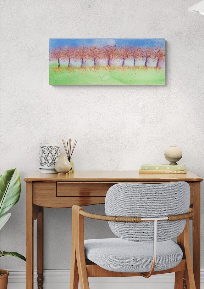 Original Painting, Acrylic, Canvas Size 100cm x 75cm Painting under this canopy of pale pink flowers inspires me every year. I took the canvas outside to paint this scene and used a fallen twig dipped into acrylic paint to create...
